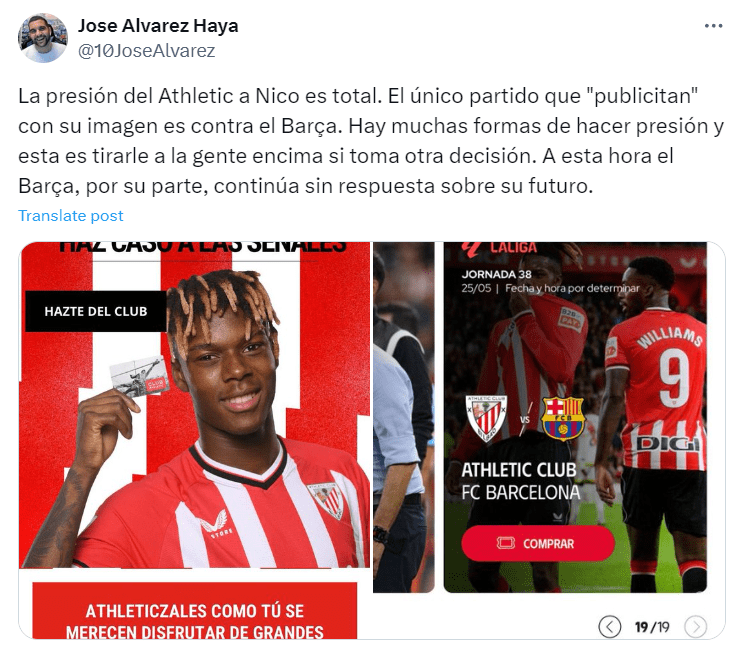 Desde aquí pediros que no hagáis el ridículo más. Habéis alcanzado altas cotas como para decir ya basta y dejarlo estar. No sé si Nico Williams vestirá de azulgrana o no; me da igual. Está en su casa, y si se queda lo trataremos como en ningún sitio.